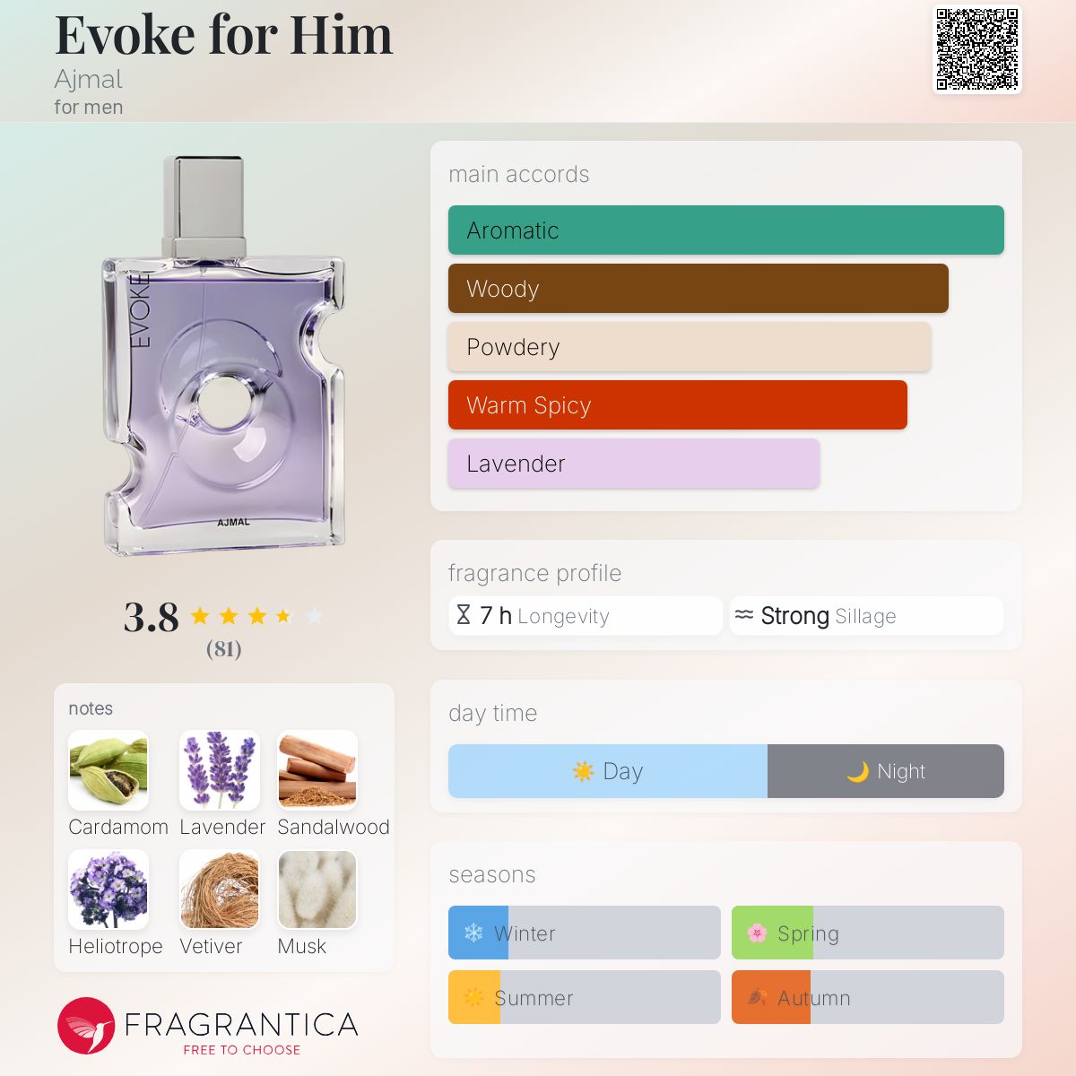 عطر ادکلن اجمل اووک مردانه-Ajmal Evoke for Him،عطری است خنک، تلخ و گیاهی که رایحه ای خطی، جذاب و مردانه بر پایه رایحه گیاهان و ادویه ها به مخاطب عرضه می دارد.
